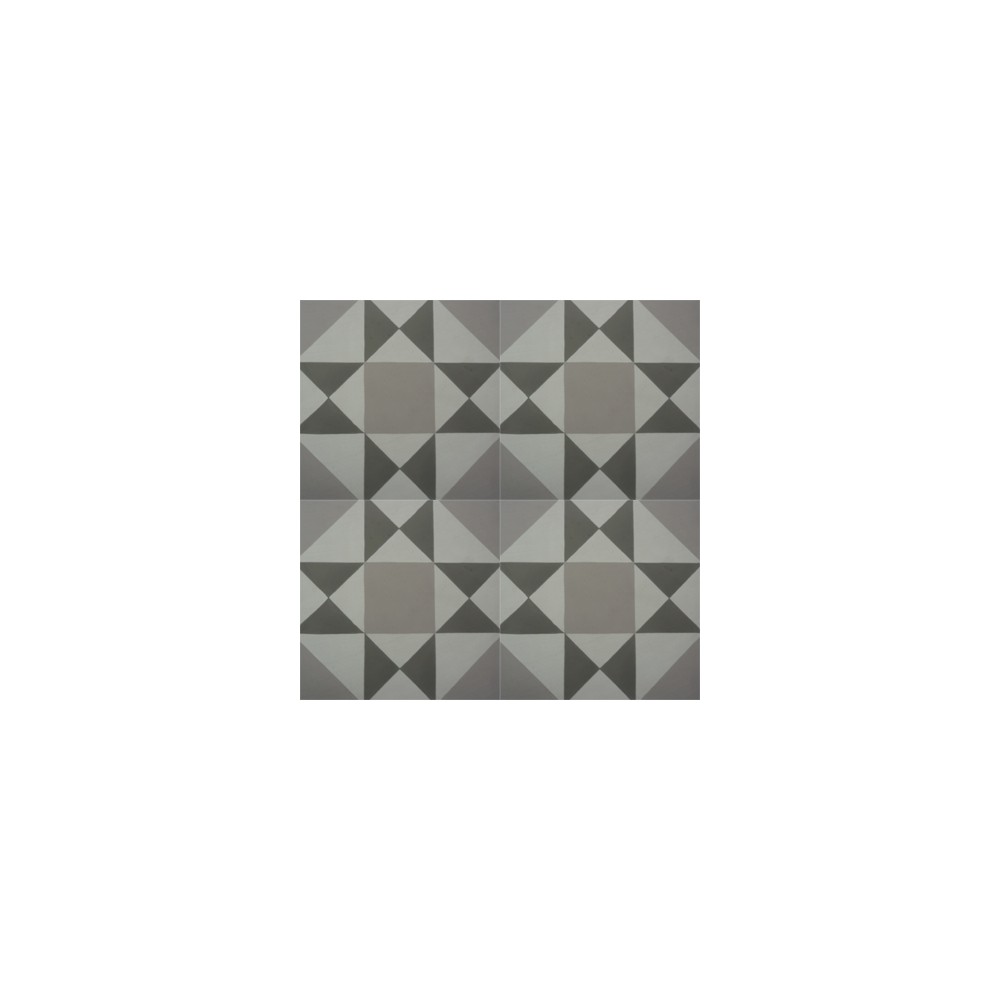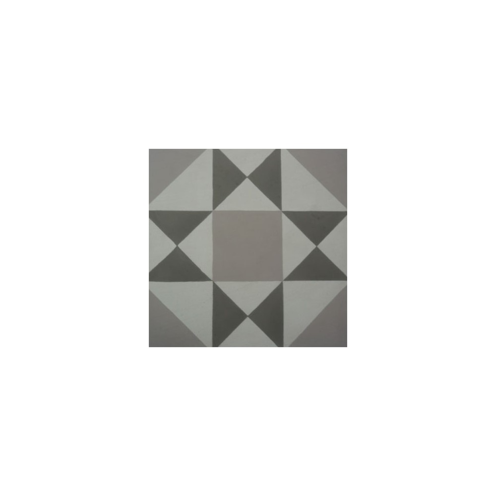 Baldosa hidráulica cuadrada de medida 20x20x1,8cm compuesta por un dibujo geométrico de 3 colores que consiste en triángulos enfrentados entre sí y cuadrados, ideal para realizar suelos a los que se quiere dotar de cierto valor y elegancia. Se puede colocar en suelos y paredes.