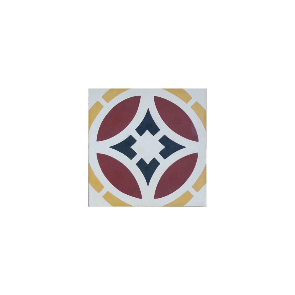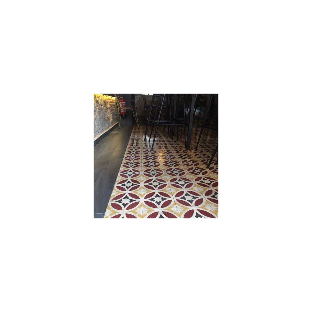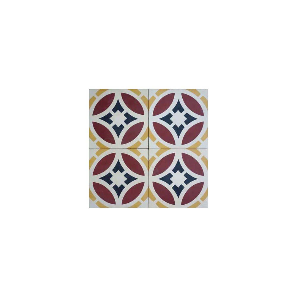 Baldosa hidráulica cuadrada de medida 20x20x1,8cm compuesta por un dibujo geométrico de 4 colores, ideal para realizar suelos a los que se quiere dotar de cierto valor y elegancia. Se puede colocar en suelos y paredes.
