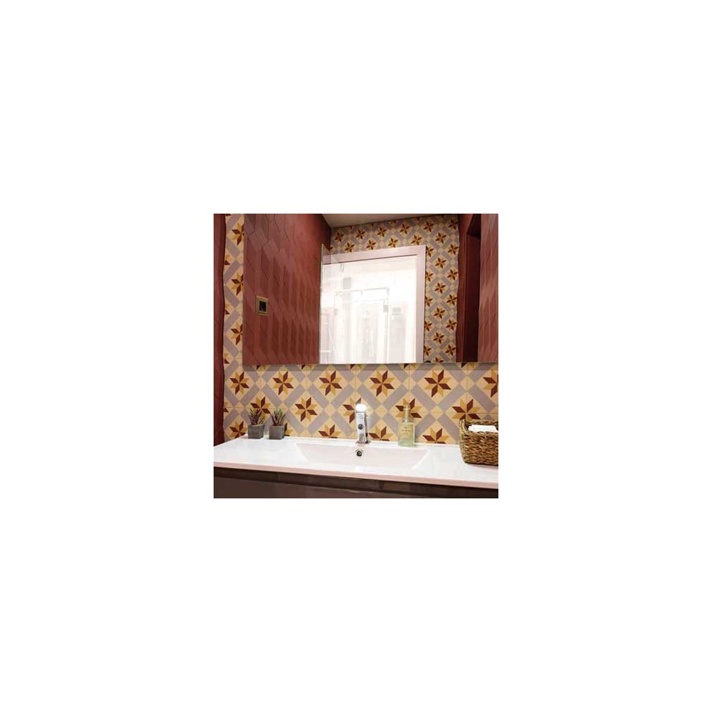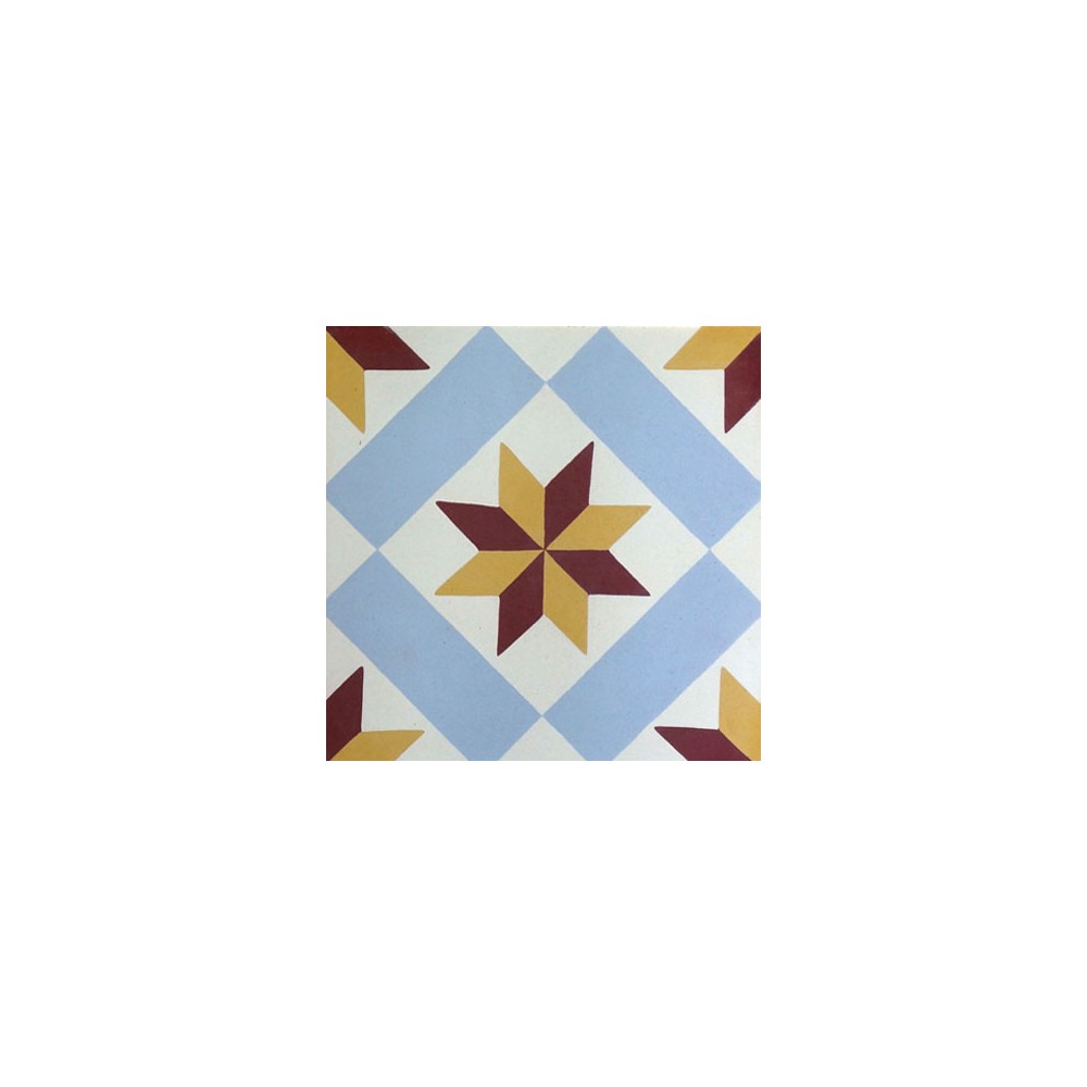 Baldosa hidráulica cuadrada de medida 20x20x1,8cm compuesta por un dibujo geométrico de 4 colores que consiste en rectángulos y rombos que accaban formando una estrella en medio de la baldosa, ideal para realizar suelos a los que se quiere dotar de cierto valor y elegancia. Se puede colocar en suelos y paredes.