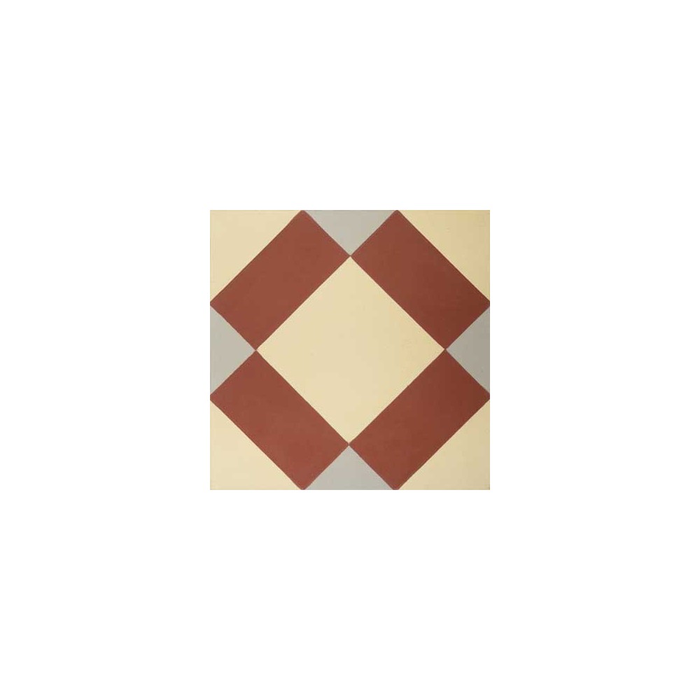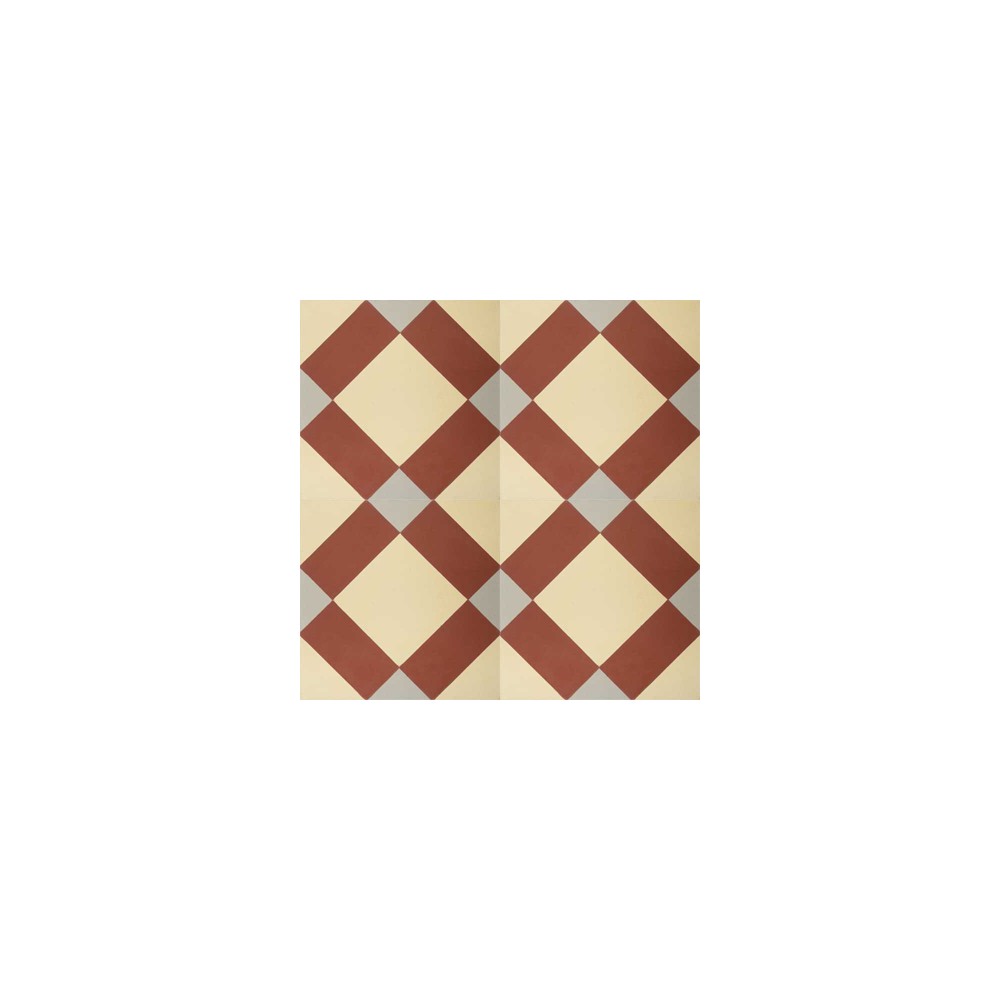 Baldosa hidráulica cuadrada de medida 20x20x1,8cm compuesta por un dibujo geométrico de 3 colores que consiste en rectángulos unidos con cuadrados que acaban formando rombos, ideal para realizar suelos a los que se quiere dotar de cierto valor y elegancia. Se puede colocar en suelos y paredes.
