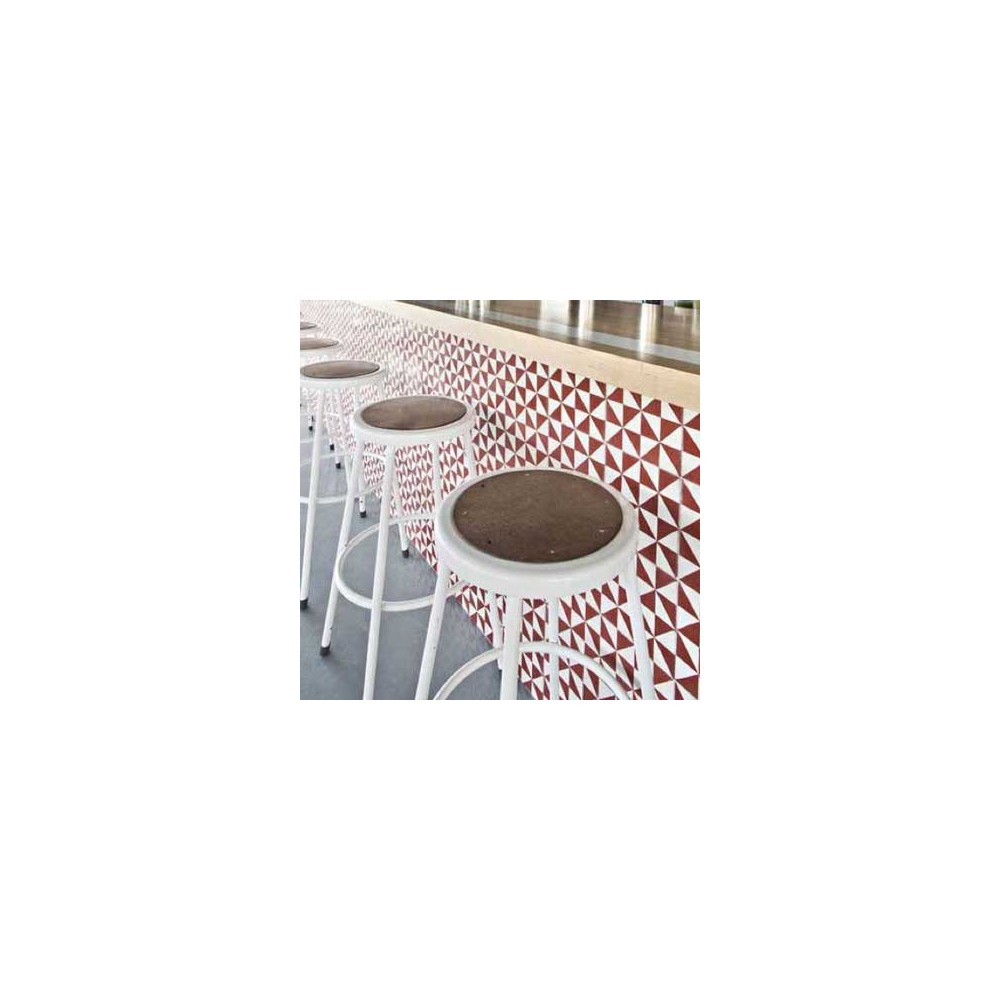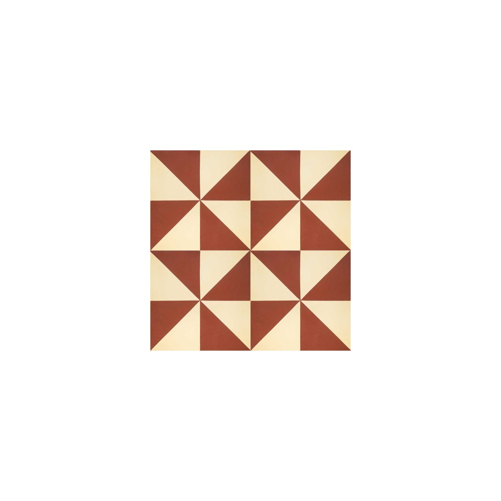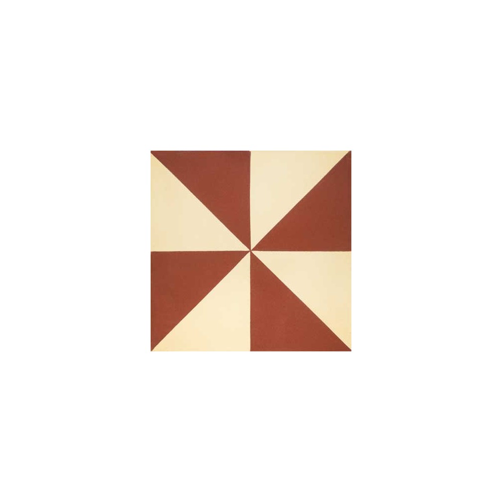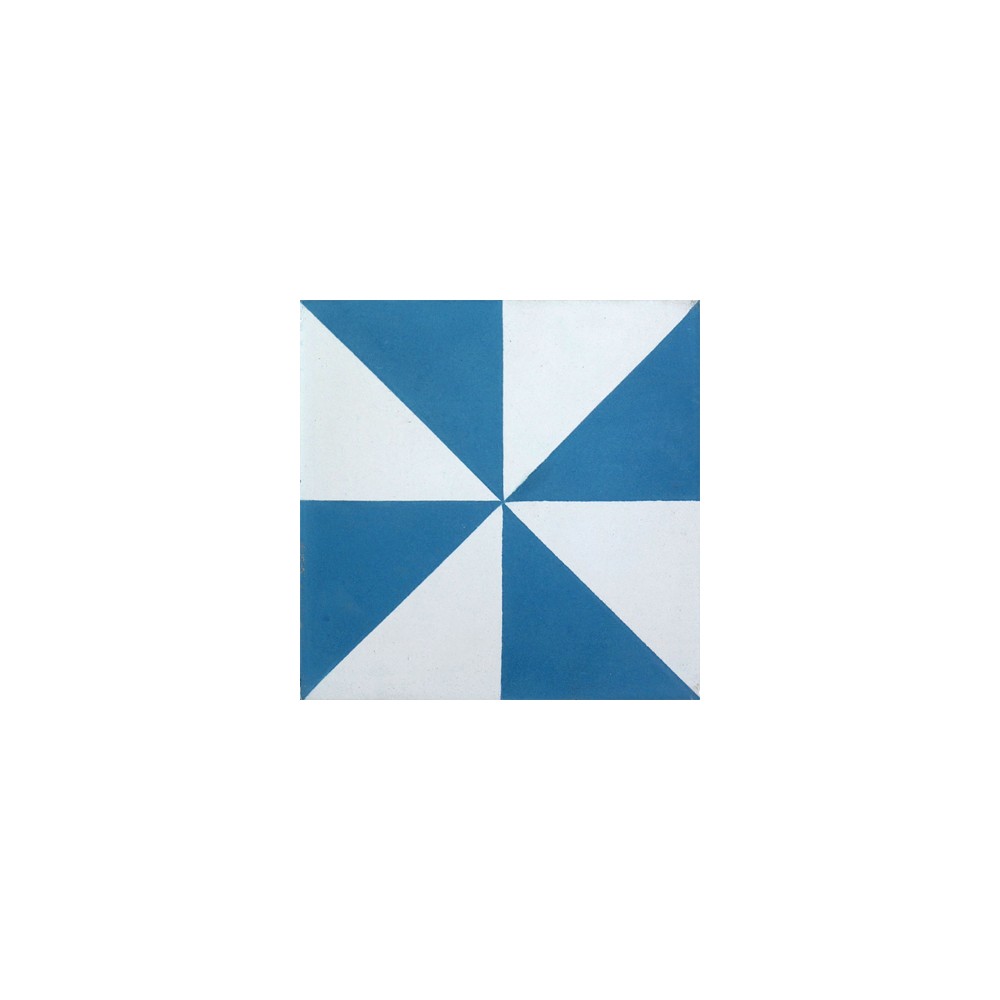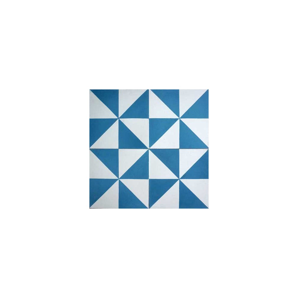 Baldosa hidráulica cuadrada de medida 20x20x1,8cm compuesta por un dibujo geométrico de 2 colores que consiste en triángulos, ideal para realizar suelos a los que se quiere dotar de cierto valor y elegancia. Se puede colocar en suelos y paredes.