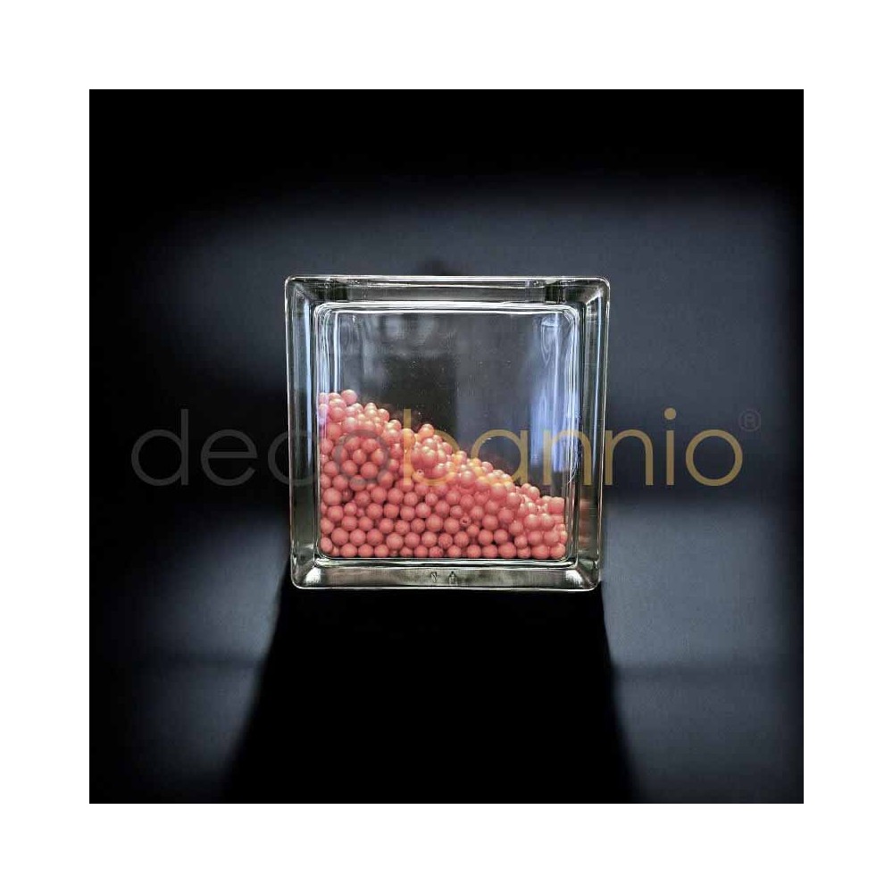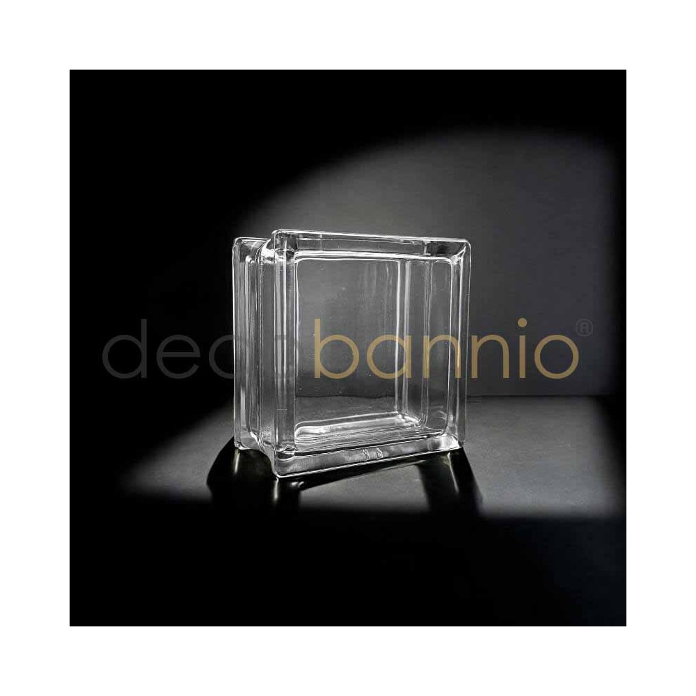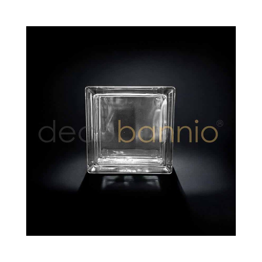 Bloque de vidrio o pavés cuadrado transparente neutro de 14,6x14,6x8cm. Tiene sus lados sin pintar y es totalmente transparente. Dispone de una abertura en uno de sus lados para ser rellenado de objetos decorativos.