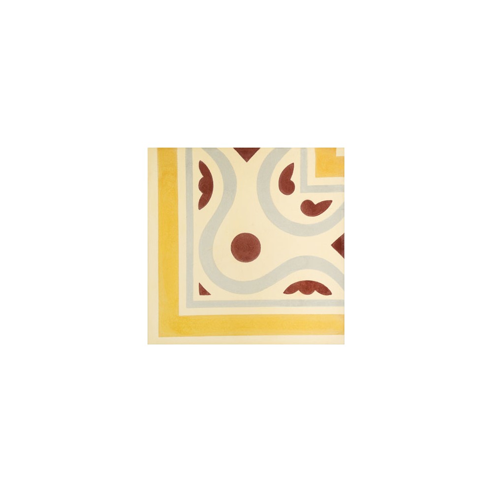 Cenefa hidráulica cuadrada de medida 20x20x1,8cm compuesta por un dibujo geométrico de 5 colores, ideal para rematar suelos a los que se quiere dotar de cierto valor y elegancia. Se puede colocar en suelos y paredes.