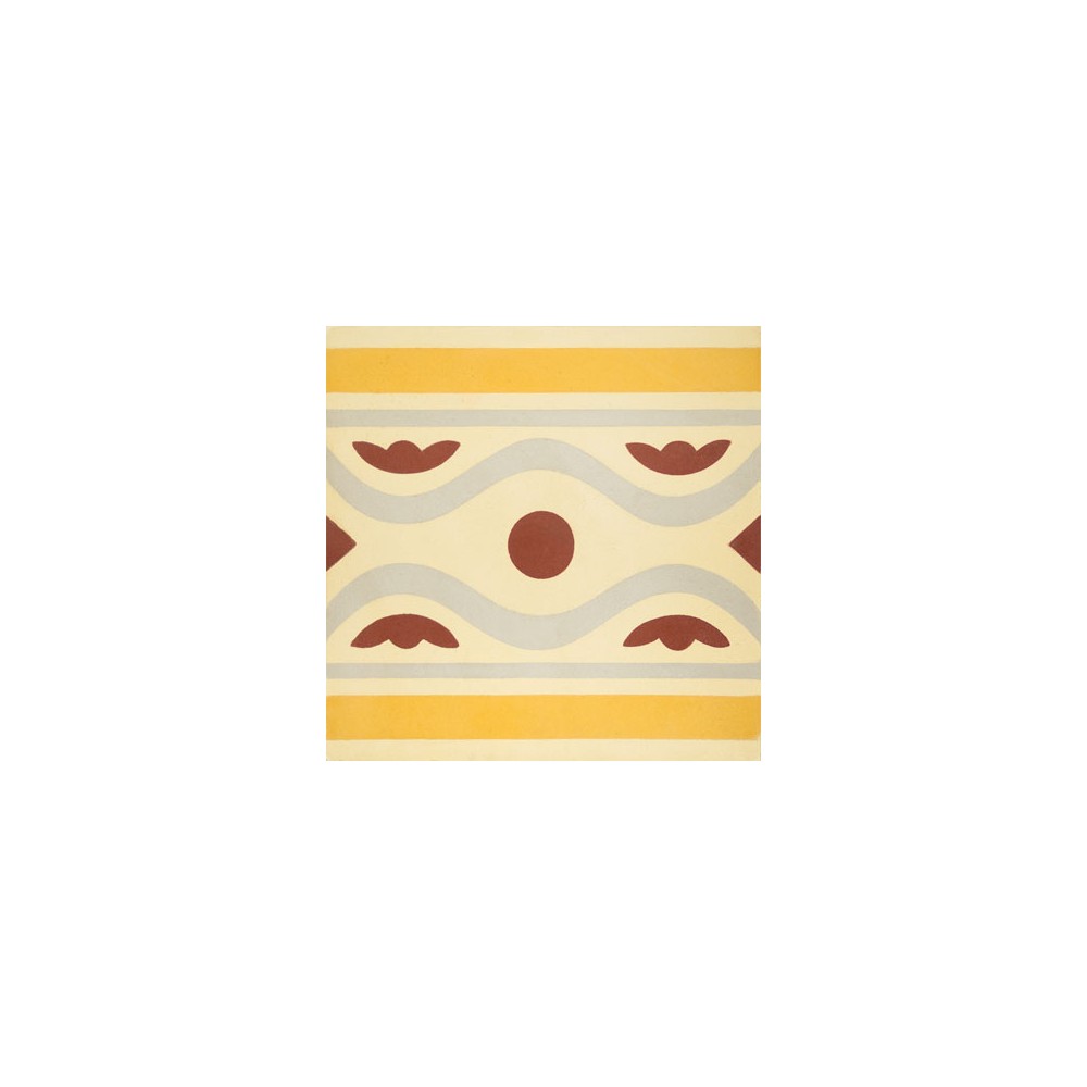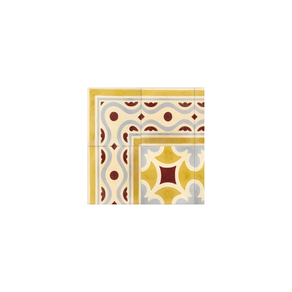 Cenefa hidráulica cuadrada de medida 20x20x1,8cm compuesta por un dibujo geométrico de 5 colores, ideal para rematar suelos a los que se quiere dotar de cierto valor y elegancia. Se puede colocar en suelos y paredes.