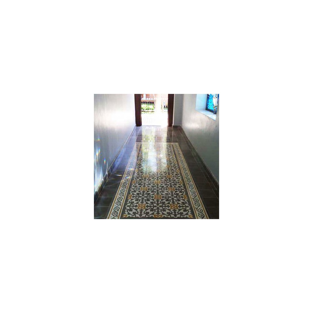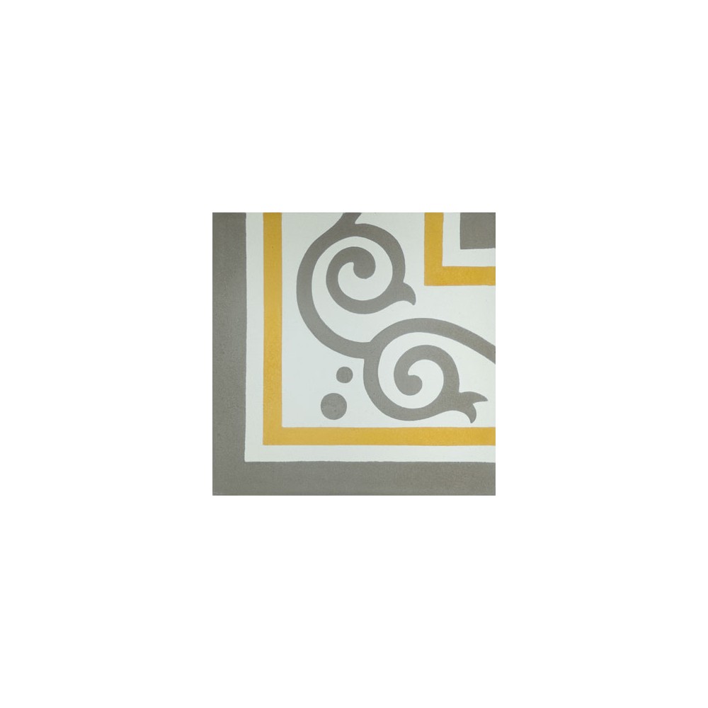 Cenefa hidráulica cuadrada de medida 20x20x1,8cm compuesta por un dibujo geométrico de 3 colores, ideal para rematar suelos a los que se quiere dotar de cierto valor y elegancia. Se puede colocar en suelos y paredes.