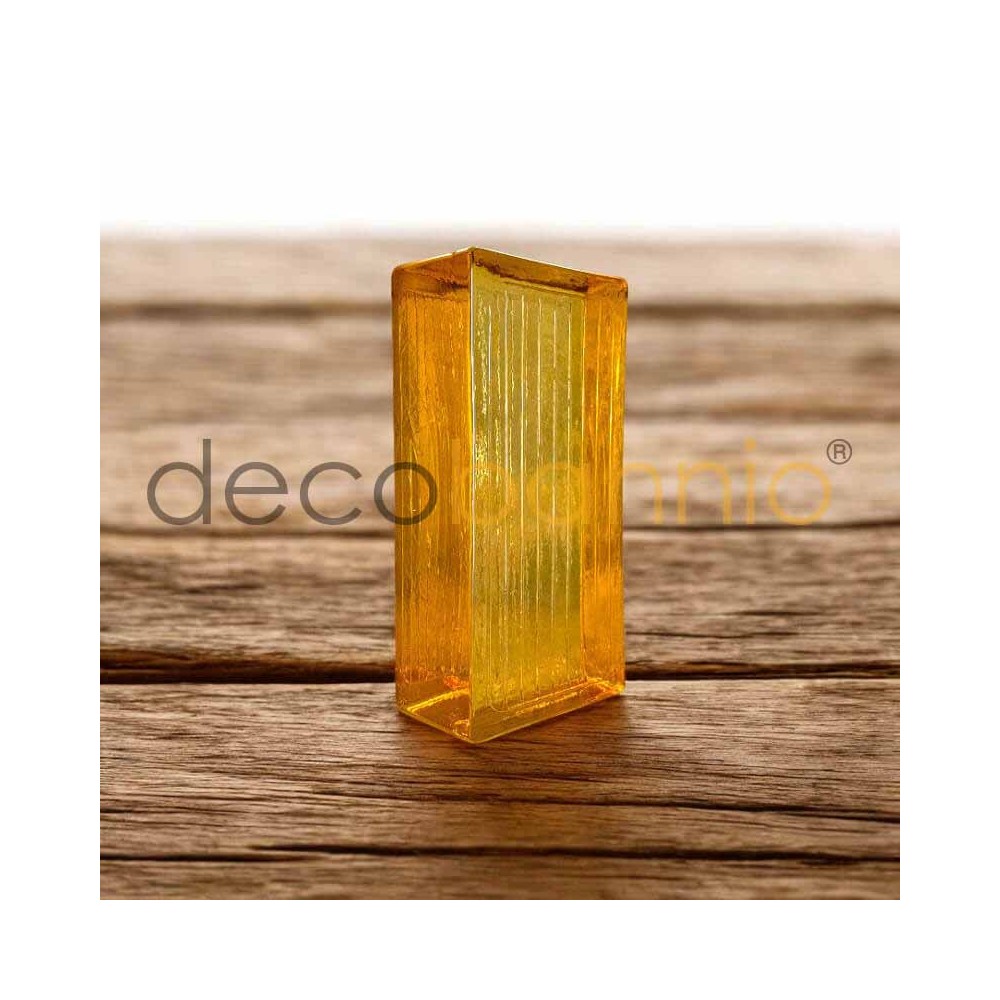 Ladrillo de vidrio macizo curvo line giallo. Ladrillo de vidrio con aspecto de lingote, líneas rectas y esquinas algo redondeadas. Líneas verticales y un marco alrededor de ellas es su decoración en relieve.