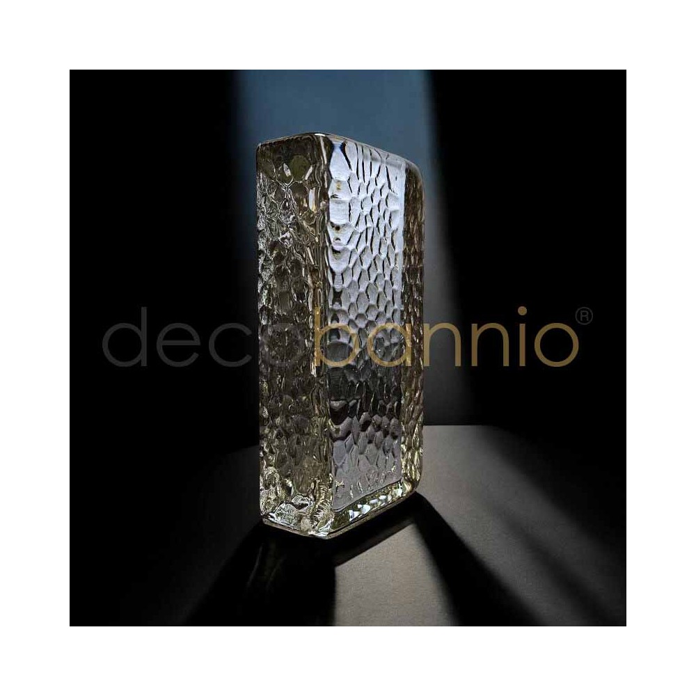El bloque está decorado con un sofisticado relieve en forma de escamas de vidrio en los cuatro lados y en la parte trasera, creando un efecto visual dinámico que añade textura y profundidad. Aunque es completamente transparente, su diseño evita que los objetos detrás de él se distingan, lo que lo convierte en una excelente opción para crear ambientes que mantengan la luminosidad sin comprometer la privacidad.