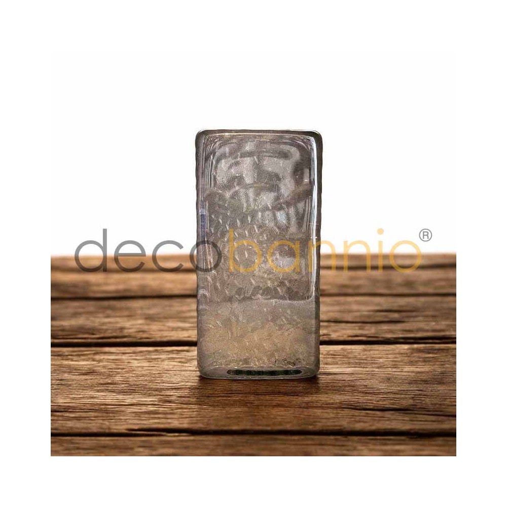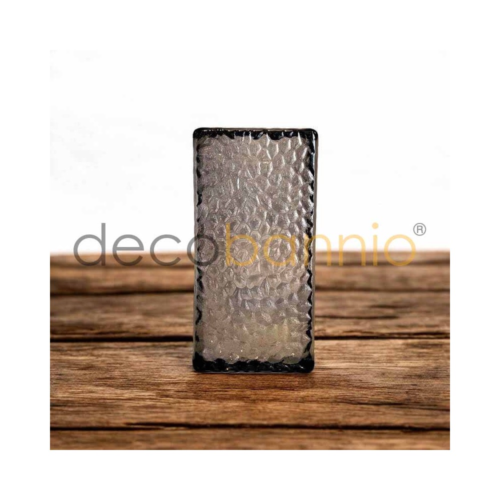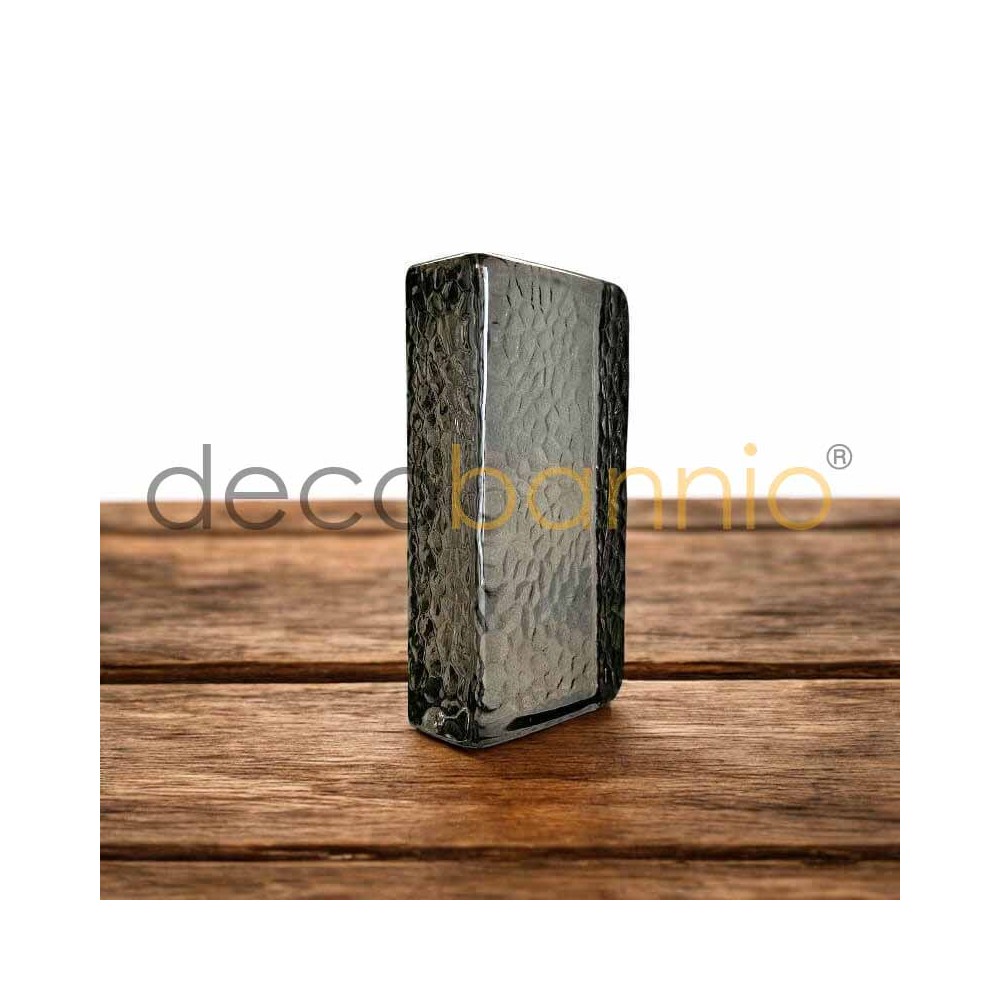 El bloque está decorado con un sofisticado relieve en forma de escamas de vidrio en los cuatro lados y en la parte trasera, creando un efecto visual dinámico que añade textura y profundidad. Aunque es completamente transparente, su diseño evita que los objetos detrás de él se distingan, lo que lo convierte en una excelente opción para crear ambientes que mantengan la luminosidad sin comprometer la privacidad.