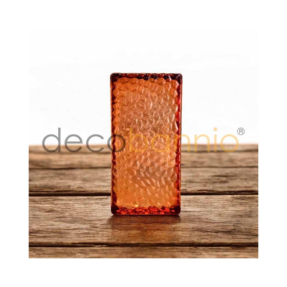 Ladrillo de vidrio macizo rectangular curvo scala ambra de 20x10x5cm. Bloque macizo, con líneas limpias y acabado artesano. Tiene un efecto decorativo en relieve, con forma de escama en sus cuatro lados y en su parte trasera. La parte delantera es totalmente lisa.