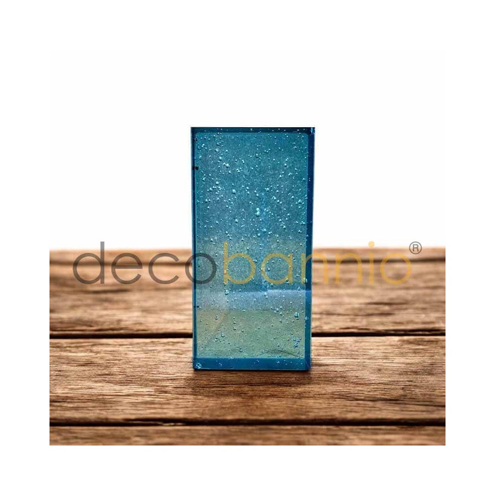 Ladrillo de vidrio recto transparente bolla azzurro. Líneas rectas y un acabado limpio con calidad óptica, es la principal característica de este ladrillo macizo. En su interior se pueden apreciar unas pequeñas burbujas que dan vida a este magnífico bloque.