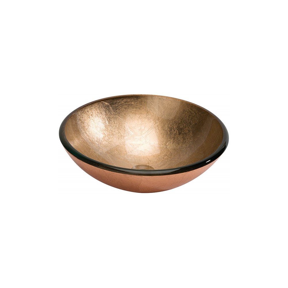 Impresionante lavabo de cristal con láminas de pan de cobre.