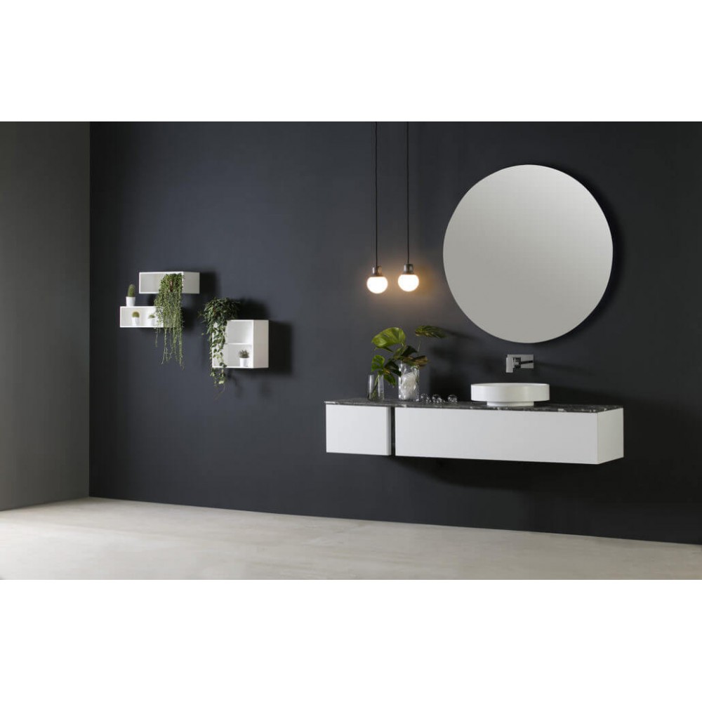 - El espejo Haruki de 29mm de espesor con retroiluminación led, antivaho e interruptor ó el espejo Ilargi de 50mm de espesor con marco de Solid Surface de 12mm;